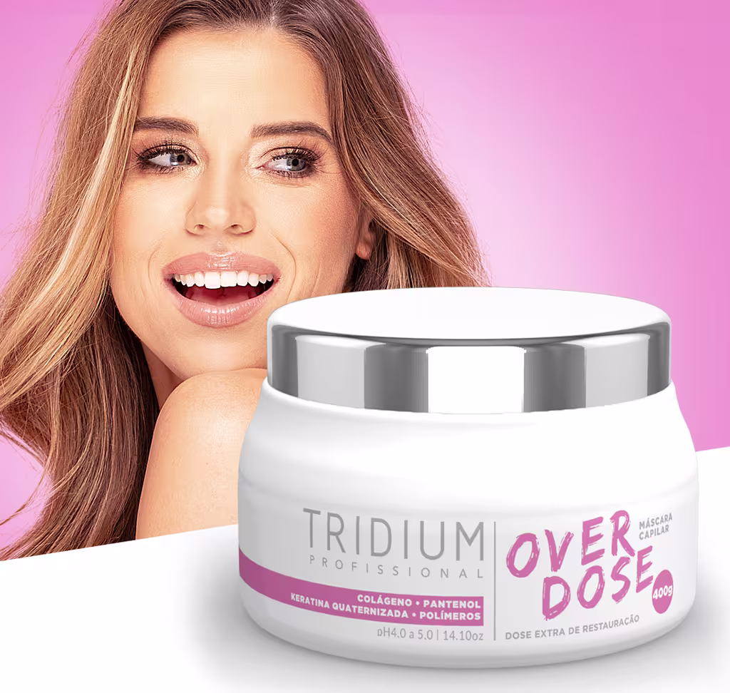 Tridium Cosméticos Overdose - Máscara Capilar 400g: dose extra de restauração, indicada para recuperação dos fios, principalmente dos que passaram por processo de descoloração ou que estejam altamente fragilizados.