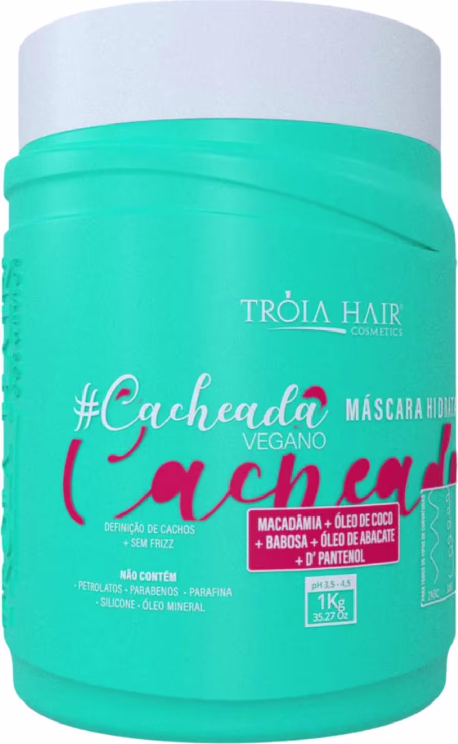 Tróia Hair Cosmetics Cacheada Vegano - Máscara Hidratante Capilar 1kg: enriquecida com ingredientes poderosos, como a Macadâmia, o Óleo de Coco e a Babosa. Uma vez em ação, esses ativos penetram profundamente no fios, restaurando a umidade perdida e revitalizando os cachos — da raiz até as pontas.