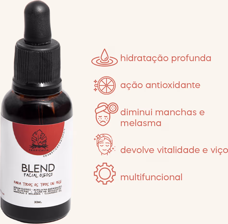 Tropicália Cosméticos Naturais Blend - Sérum Facial 30ml: com ação multifuncional, deve ser utilizado como último passo da skincare noturna, ele é rico em ômegas 6 e 9 e vitaminas A, F e E. A vitamina F. Além de apresentar restauração celular e ação anti-inflamatória, aumenta a barreira protetora da pele, impedindo a perda de água e sua desidratação. Poderoso antioxidante, também ajuda a combater o envelhecimento precoce e manchas.