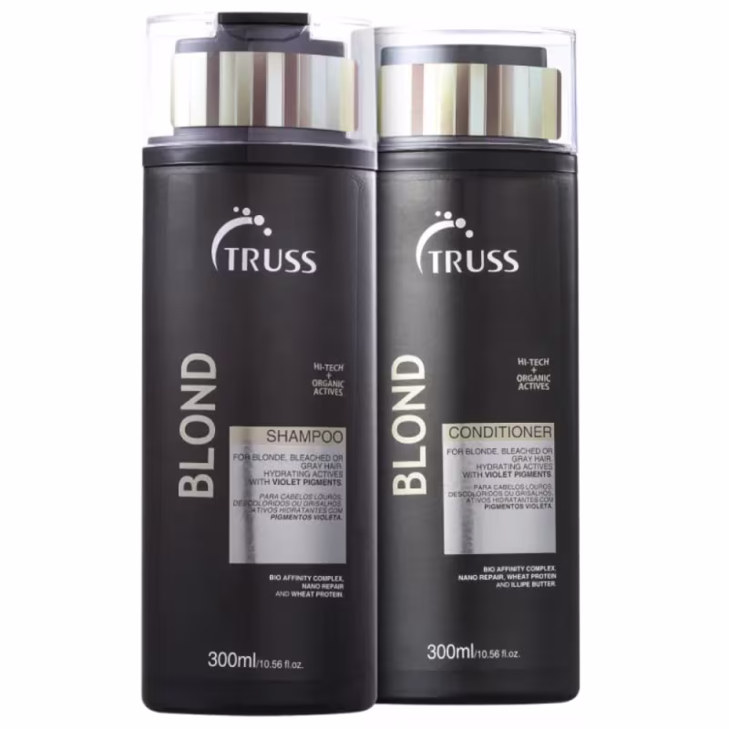 Kit com shampoo e condicionador para cabelos loiros. Truss Blond Duo Bright Absolute garante loiros cheios de vitalidade e brilho.