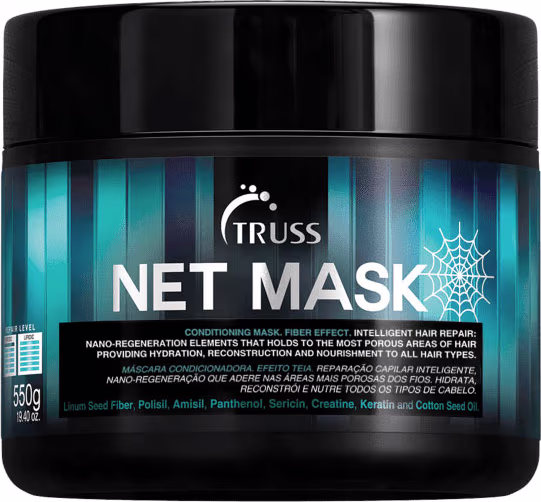 Truss Net - Máscara Capilar 550g: repõe massa e devolve a elasticidade e força aos fios. Ela sela as cutículas, prolonga a hidratação e intensifica o brilho do cabelo. Seus ativos regeneram os fios danificados, que voltam a ter um aspecto saudável. Quando usada no cabelo afro, oferece disciplina e definição. Seus fios ficam disciplinados, sedosos e brilhantes.