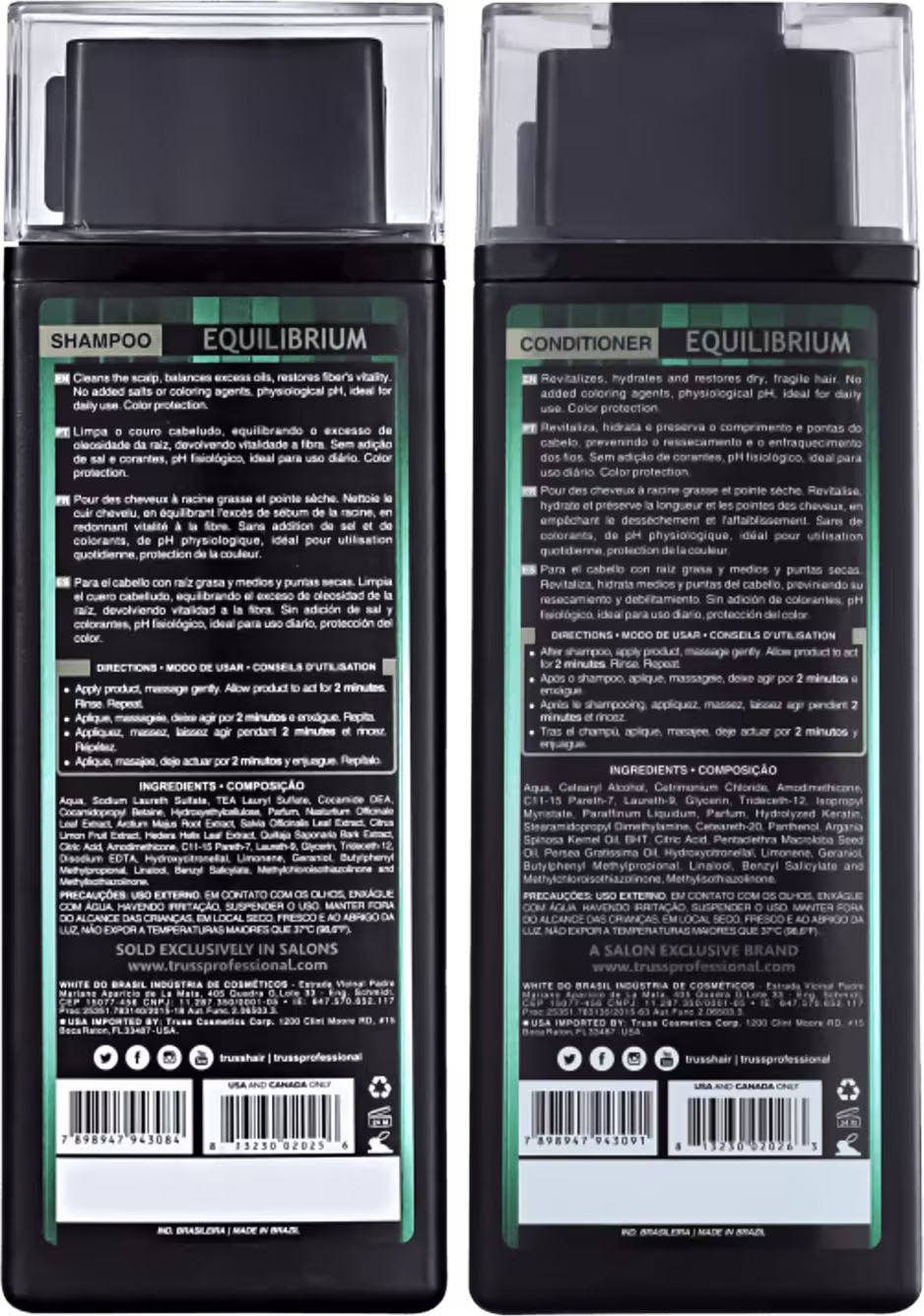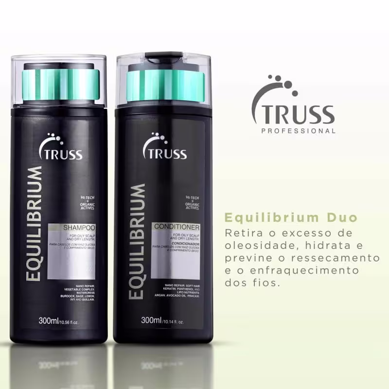 O Kit Truss Equilibrium Duo foi desenvolvido especialmente para quem apresenta o couro cabeludo mais oleoso e as pontas ressecadas. Sua fórmula atua no couro cabeludo, equilibrando a umidade natural, devolvendo a hidratação para os fios e evitando o enfraquecimento prematuro das pontas.