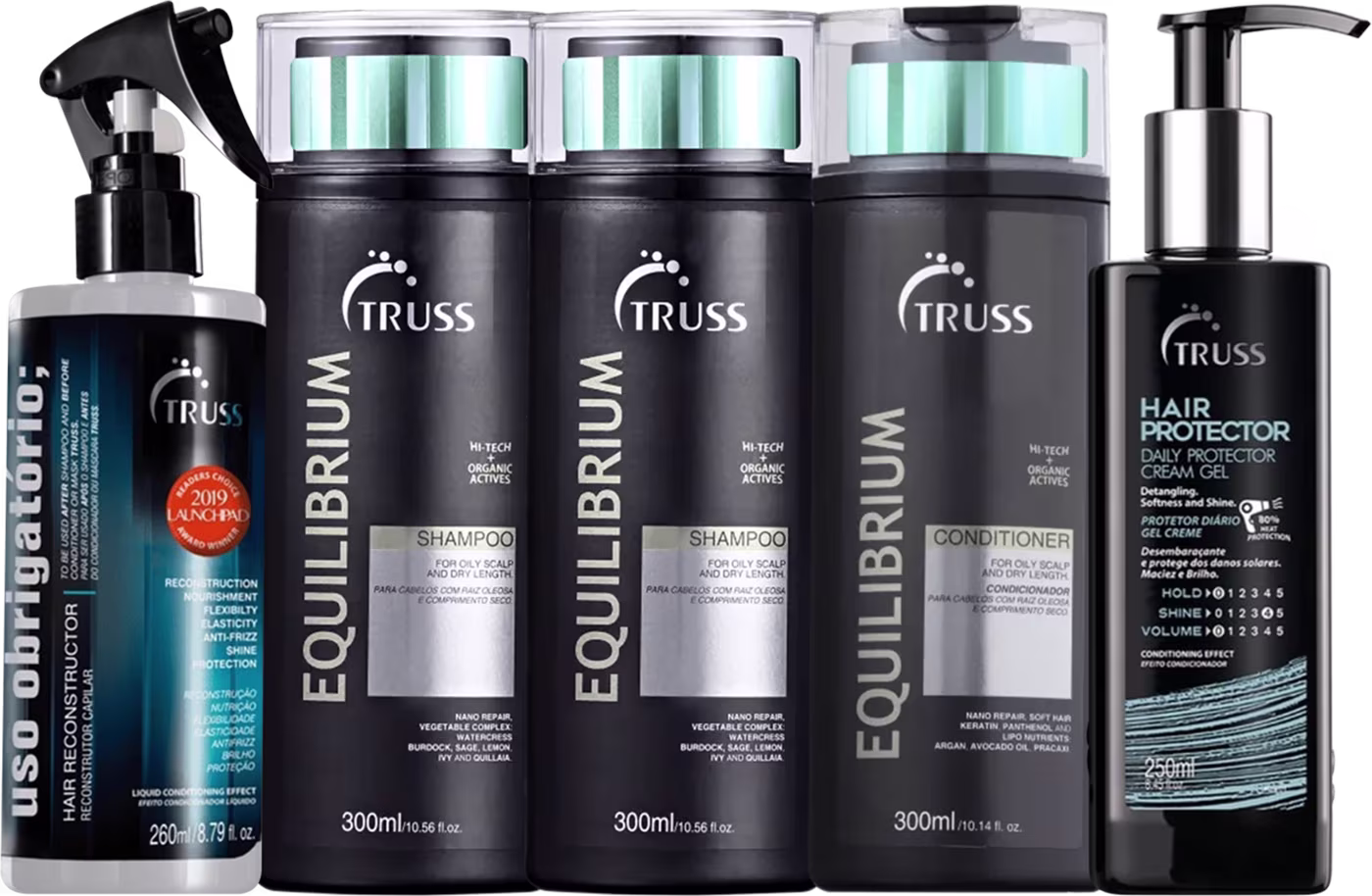 Kit Truss Equilibrium + Uso Obrigatório + Hair Protector: controla a oleosidade e o frizz. Melhores Kits de Tratamento Capilar de Truss na BLZ. Ver mais ❯