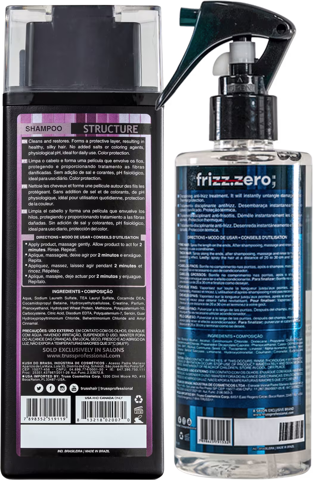 O Kit Truss Frizz Zero Structure Shampoo promove limpeza enquanto forma uma película que envolve os fios, recuperando e encorpando as fibras danificadas. Também acompanha um condicionador ultraconcentrado e de fácil absorção, desenvolvido para condicionar, hidratar, selar a cutícula capilar e devolver rapidamente a maciez, o brilho e a maleabilidade aos fios, podendo ser usado como pré-shampoo ou máscara líquida nas lavagens.