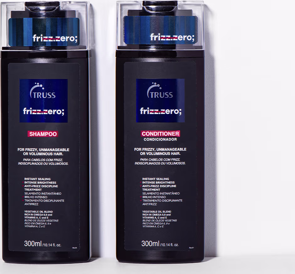 Kit com shampoos e condicionador para cabelos com frizz. TRUSS Frizz Zero Trio Beauty sela os fios, conferindo ação desfrizante.