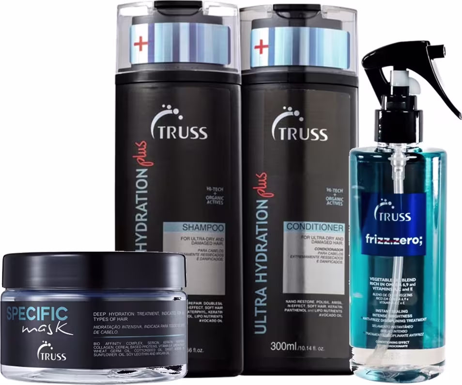 Kit de tratamento capilar para cabelos danificados. Truss Hidratação Antifrizz hidrata intensamente, recuperando a saúde dos fios.