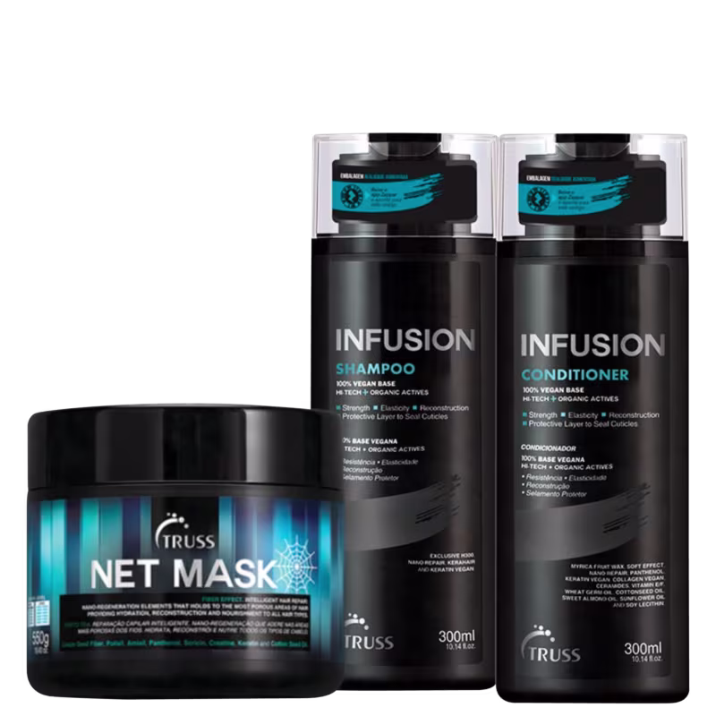 O Kit Truss Infusion + Net Mask garante resistência, reconstrução e selamento protetor, prolonga a hidratação e intensifica o brilho do cabelo.
