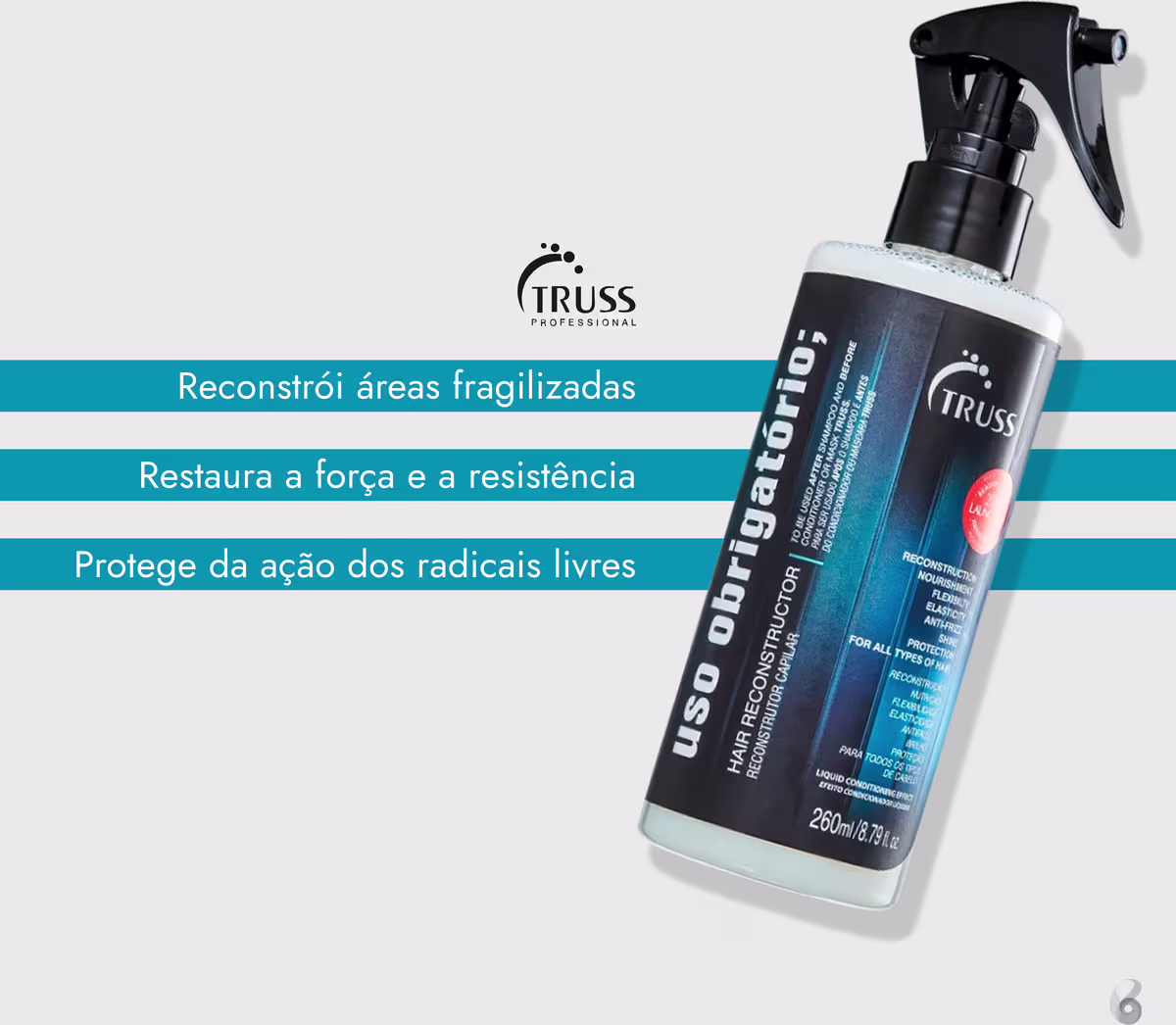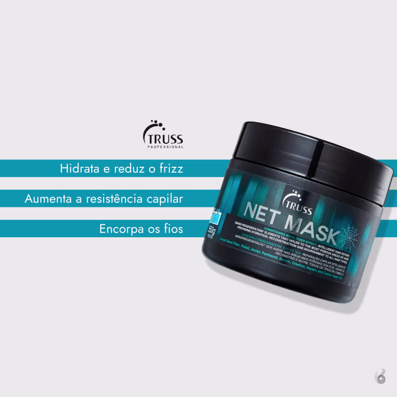 Kit Truss Net Obrigatório conta com uma máscara repositora de massa com fórmula inteligente, que regenera as hastes danificadas e prolonga a hidratação dos fios para um aspecto saudável e bonito. Além disso, o tratamento reconstrutor fortalece o cabelo, protege contra desgastes e quebras futuros.