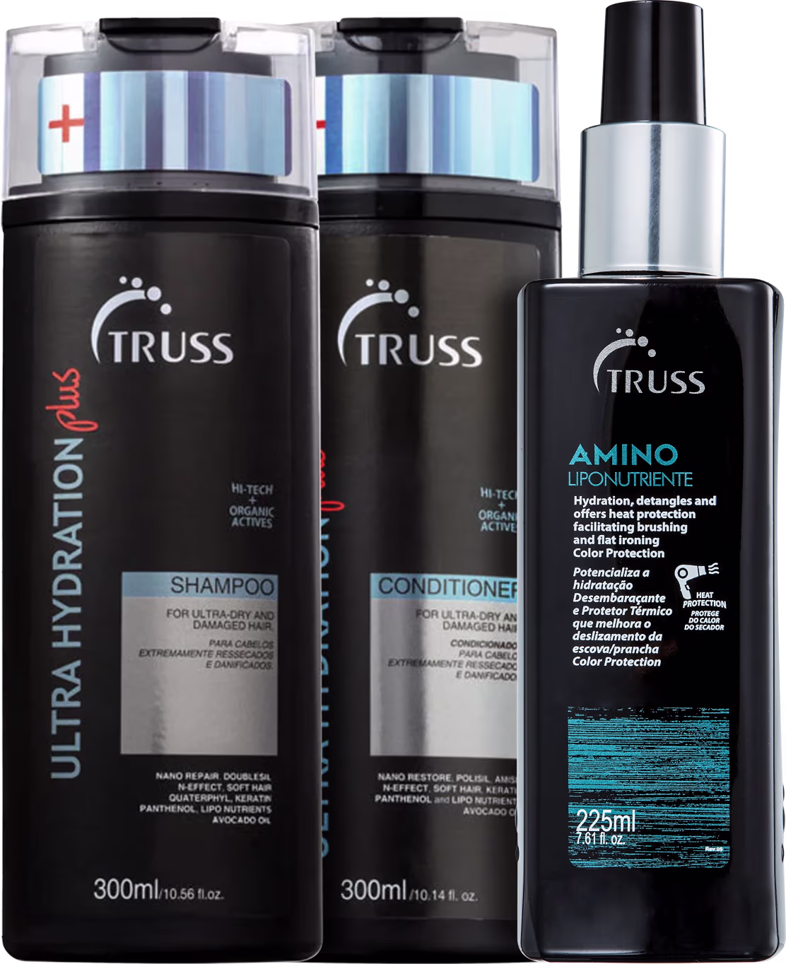 Não sei o CEPKit com shampoo, condicionador e protetor térmico para cabelos secos ou ressecados. Truss Ultra Hydration Amino Protetor recupera a maciez, devolve a força e o brilho dos fios.