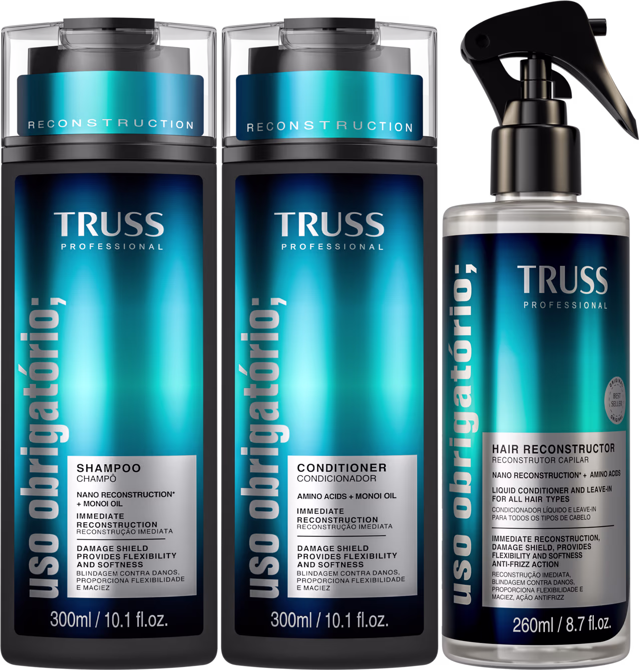 Kit com shampoo, condicionador e tratamento reconstrutor para cabelos danificados e ressecados. TRUSS Uso Obrigatório Hair Reconstructor reconstrói a fibra capilar, devolve força, saúde, vitalidade e brilho.