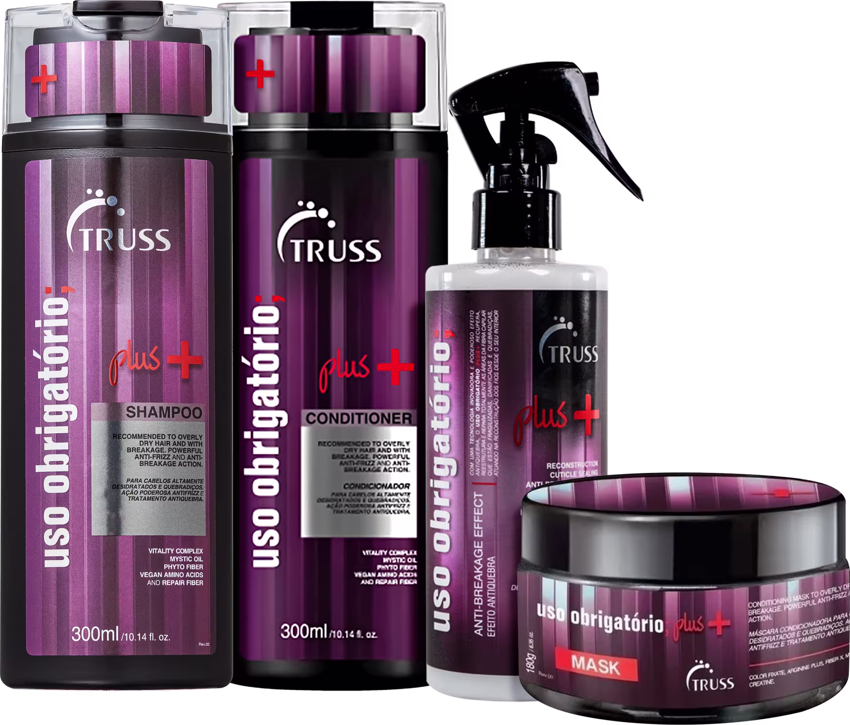 Kit com shampoo, condicionador, máscara e tratamento reconstrutor para cabelos danificados e quebradiços. TRUSS Uso Obrigatório; Plus+ atua na reconstrução total da fibra capilar com poderoso efeito antiquebra.