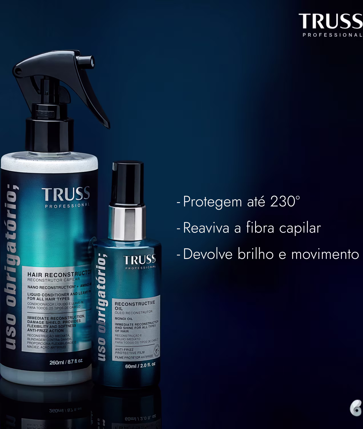 Não sei o CEPKit com tratamento líquido e óleo reconstrutor para cabelos quebradiços, desidratados e com química. TRUSS Uso Obrigatório Proteção ideais para uma escovação protegida de danos causados pelo calor das ferramentas, como babyliss, prancha e secador de cabelos.