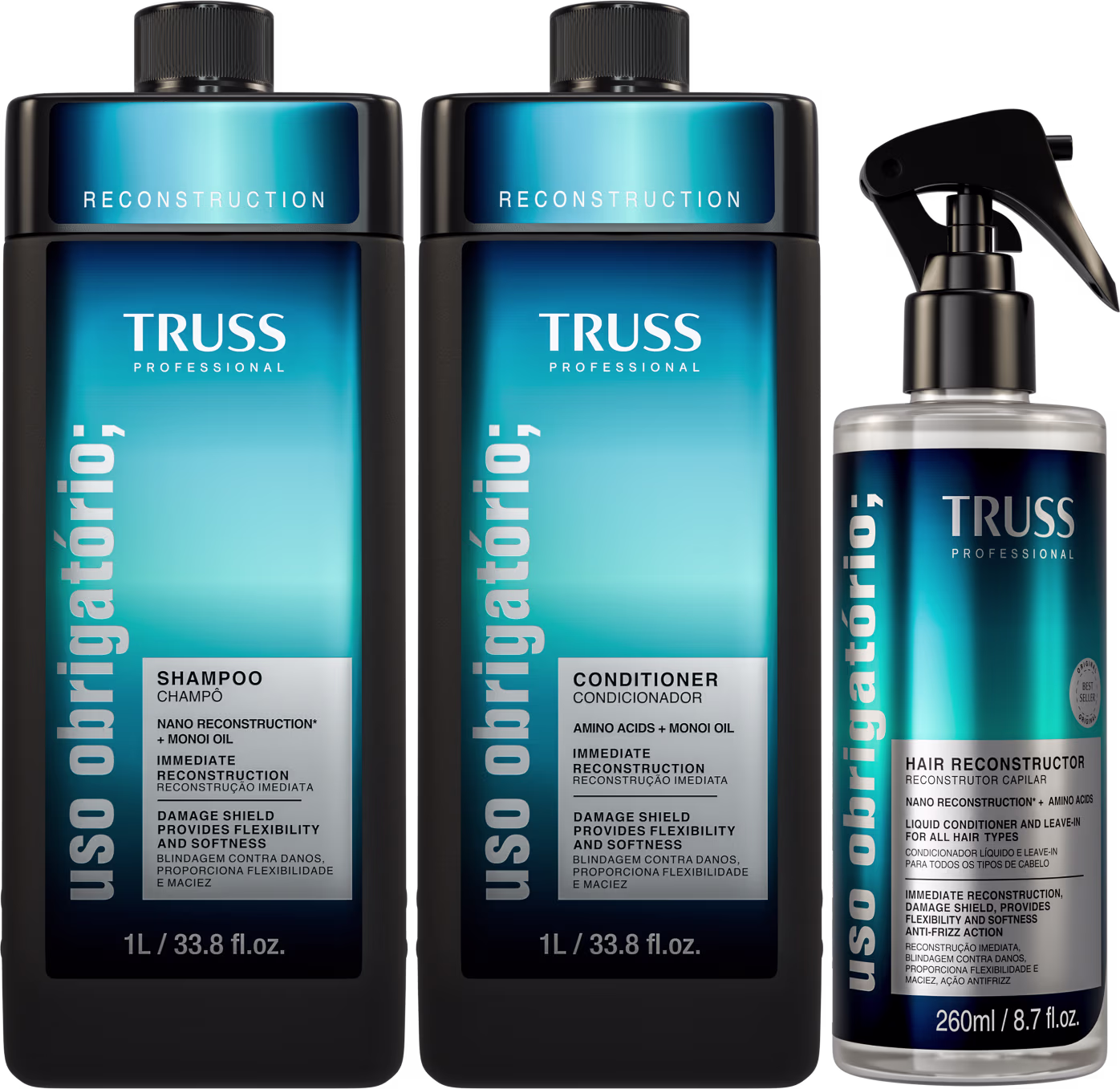 Não sei o CEPKit com shampoo, condicionador e spray reconstrutor para cabelos danificados e ressecados. TRUSS Uso Obrigatório Reconstruction Salão é ideal para reconstrução capilar e blindagem para fios ainda mais saudáveis, com menos frizz, mais fortes e 87% menos quebra.