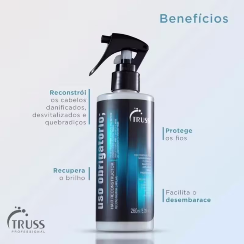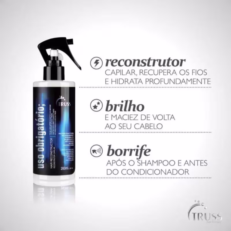 O Kit Truss Uso Obrigatório Tratamento Reconstrutor é um poderoso produto de reconstrução imediata! Age com a reconstrução dos fios que estão danificados e fragilizados, restaura a força e a resistência. Resgata a elasticidade e o brilho dos fios, reconstrói cabelos desvitalizados, quebradiços e que fazem uso constantes de secador e pranchas, atua também como desembaraçante e antifrizz.
