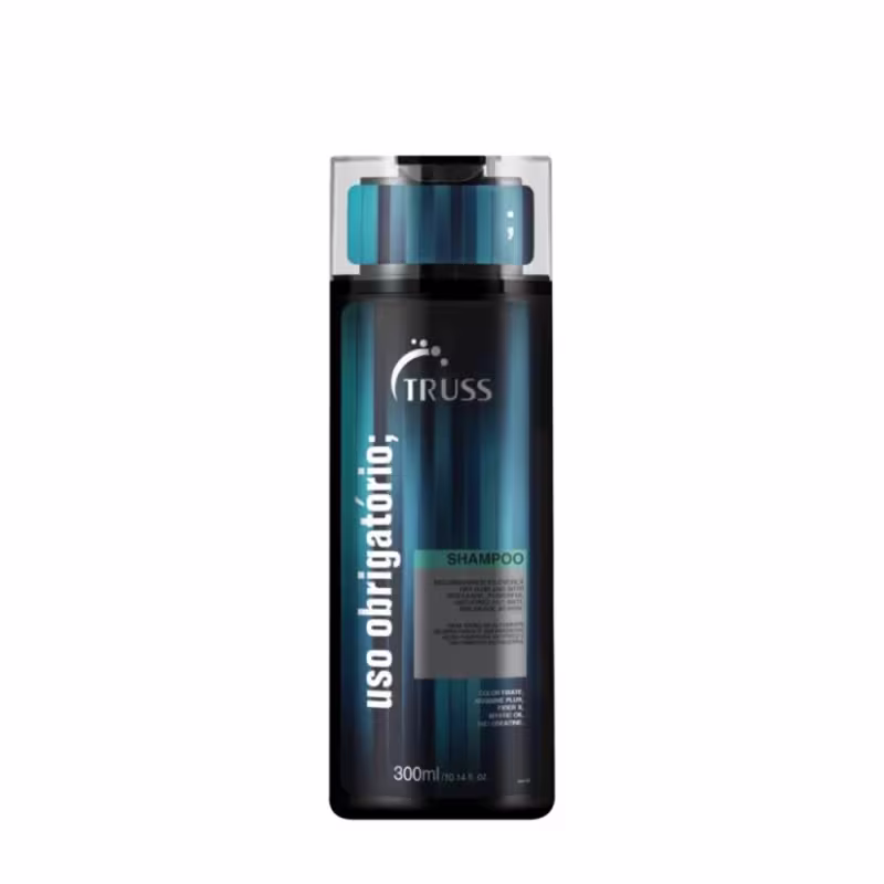 Truss Uso Obrigatório - Shampoo 300ml: limpa suavemente, reduzindo os danos em cabelos com química, hidrata e sela as cutículas. Promove suavidade e brilho aos fios e possui ação antidesbotamento.