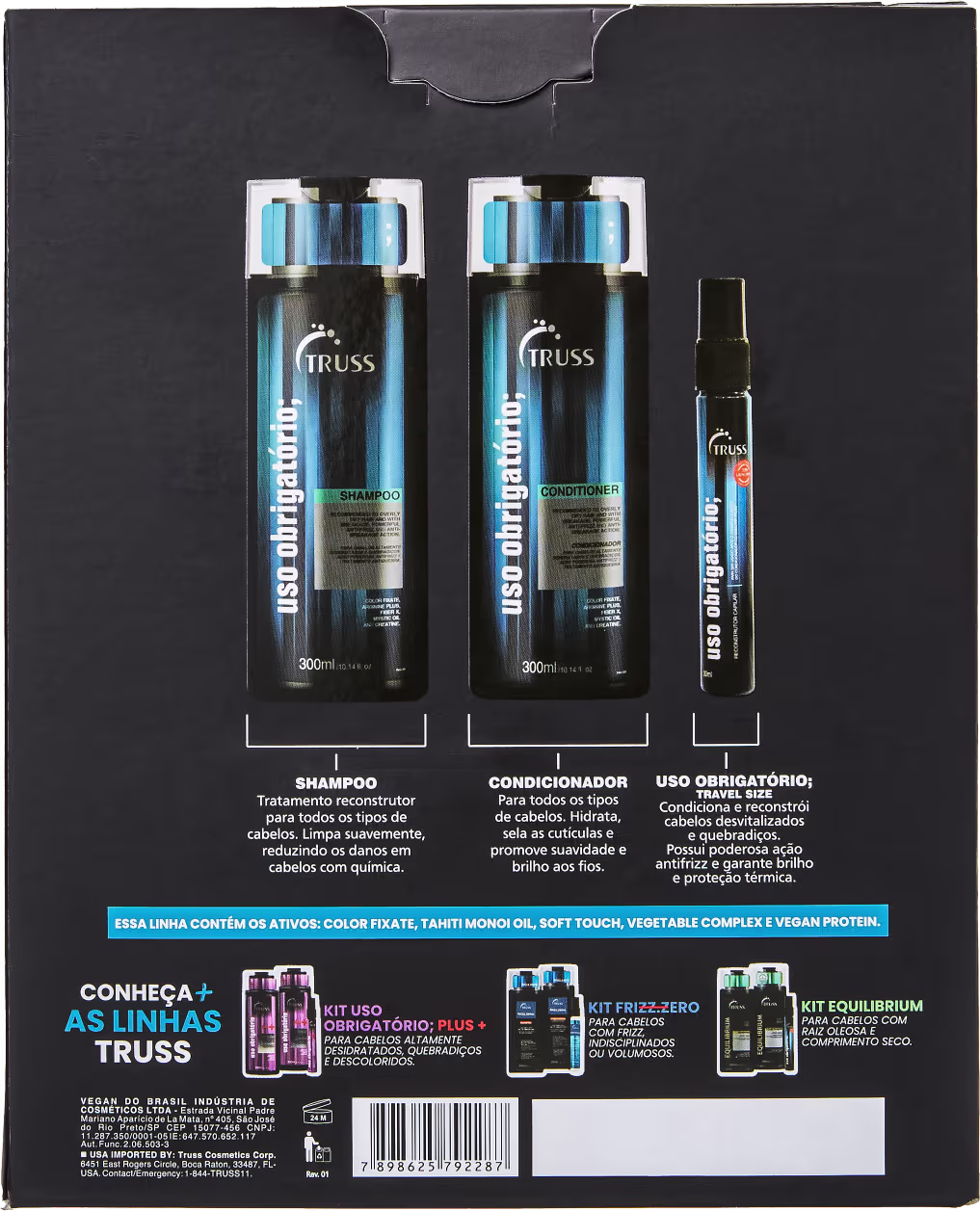 O Kit Truss Uso Obrigatório Triplo Diário é um verdadeiro sucesso mundial! Seus tratamentos trazem diversos benefícios para os fios, inclusive reparação de danos, redução do frizz, desembaraço, combate às pontas duplas e proteção ao desbotamento da cor.