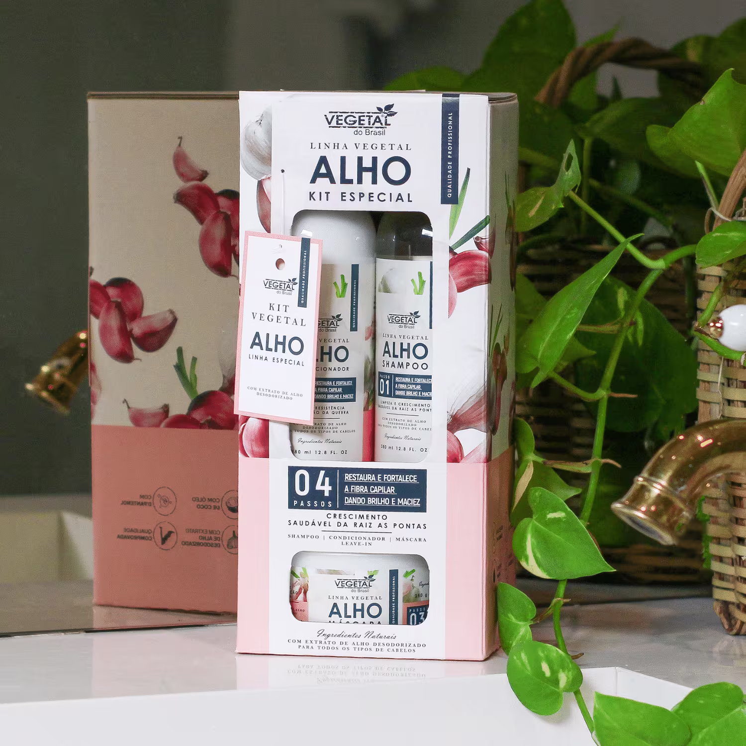 O Kit Vegetal do Brasil Alho foi desenvolvido para dar mais fortalecimento e resistência aos cabelos, contém extrato de alho, extrato de aloe vera e calêndula, que fortalecem a raiz enfraquecida e combatem a queda e D’Pantenol e Óleo de Algodão que reparam os danos. O alho é desodorizado, o aroma é um perfume suave e agradável.