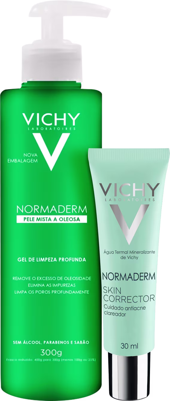 Kit com gel de limpeza e sérum antiacne. Vichy Antiacne promove limpeza profunda, removendo até impurezas acumuladas nos poros, com controle da oleosidade. Tem ação calmante e anti-inflamatória importante para quem sofre com acne. Apesar de limpar profundamente, não provoca o ressecamento da pele e nem deixa aquela sensação desconfortável de repuxamento.