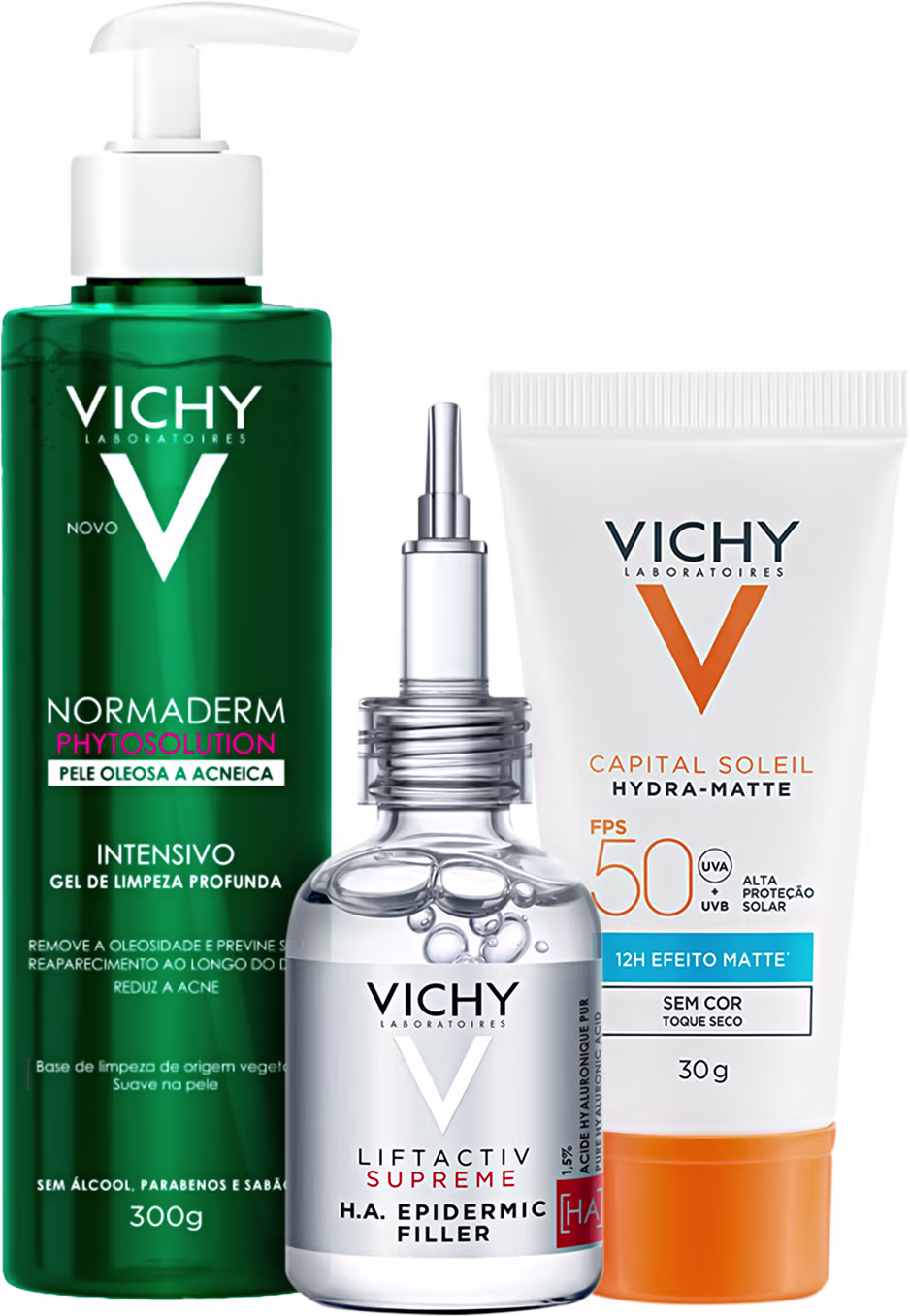 Kit com gel de limpeza, sérum e protetor solar para todos os tipos de pele. O Vichy Capital Liftactiv Normaderm Intensivo remove a oleosidade, elimina rugas e protege o rosto.