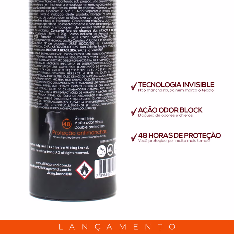 Desodorante antitranspirante spray. Viking Route 66 oferece 48 horas de proteção contra o mau cheiro ou suor com tecnologia invisible.