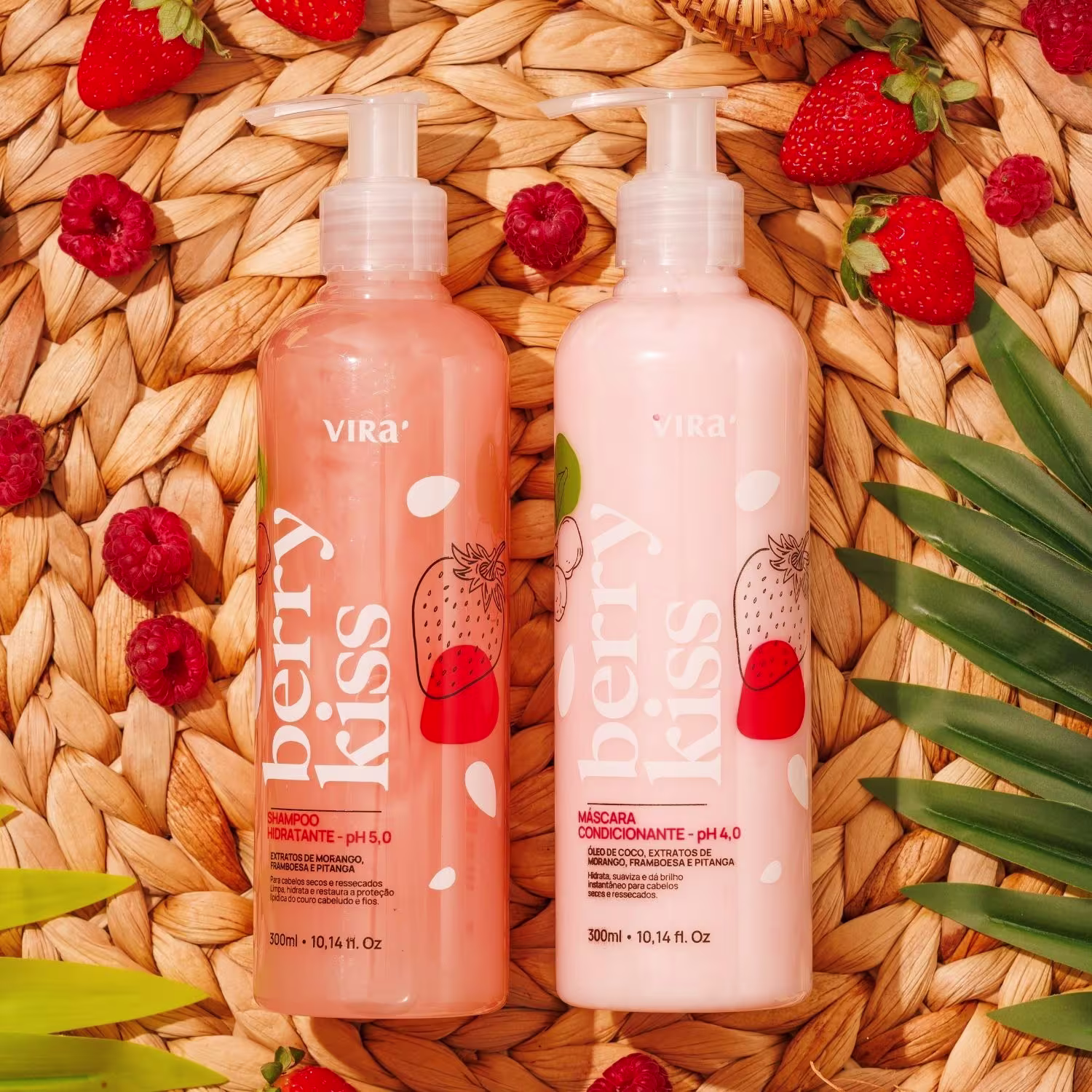 O Kit Virá Cosméticos Berry Kiss traz poderosos nutrientes das frutas vermelhas, combinados com óleo de coco e agentes hidratantes, que proporcionam um tratamento intenso para cabelos ressecados e opacos. Esses ativos retêm a umidade, suavizam os fios, reduzem o frizz, melhoram a elasticidade e aumentam o brilho.