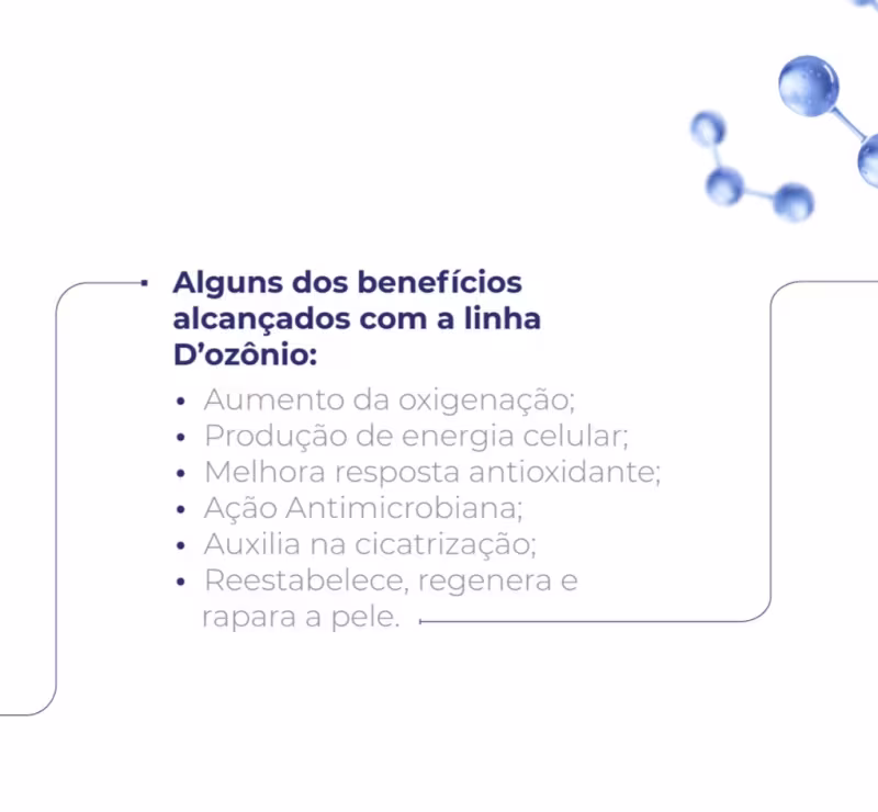 Os produtos da linha D'Ozônio foram formulados com a inédita e exclusiva associação de ativos conhecidos pelos profissionais de ozonioterapia e estética, como: Óleo de Girassol Ozonizado, Óleo de Rosa Mosqueta e Prebióticos, que garantem a máxima revitalização para uma pele mais viçosa, saudável e hidratada. Recomendado uma aplicação mensal ou de acordo com a avaliação da pele.