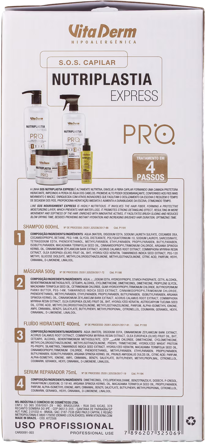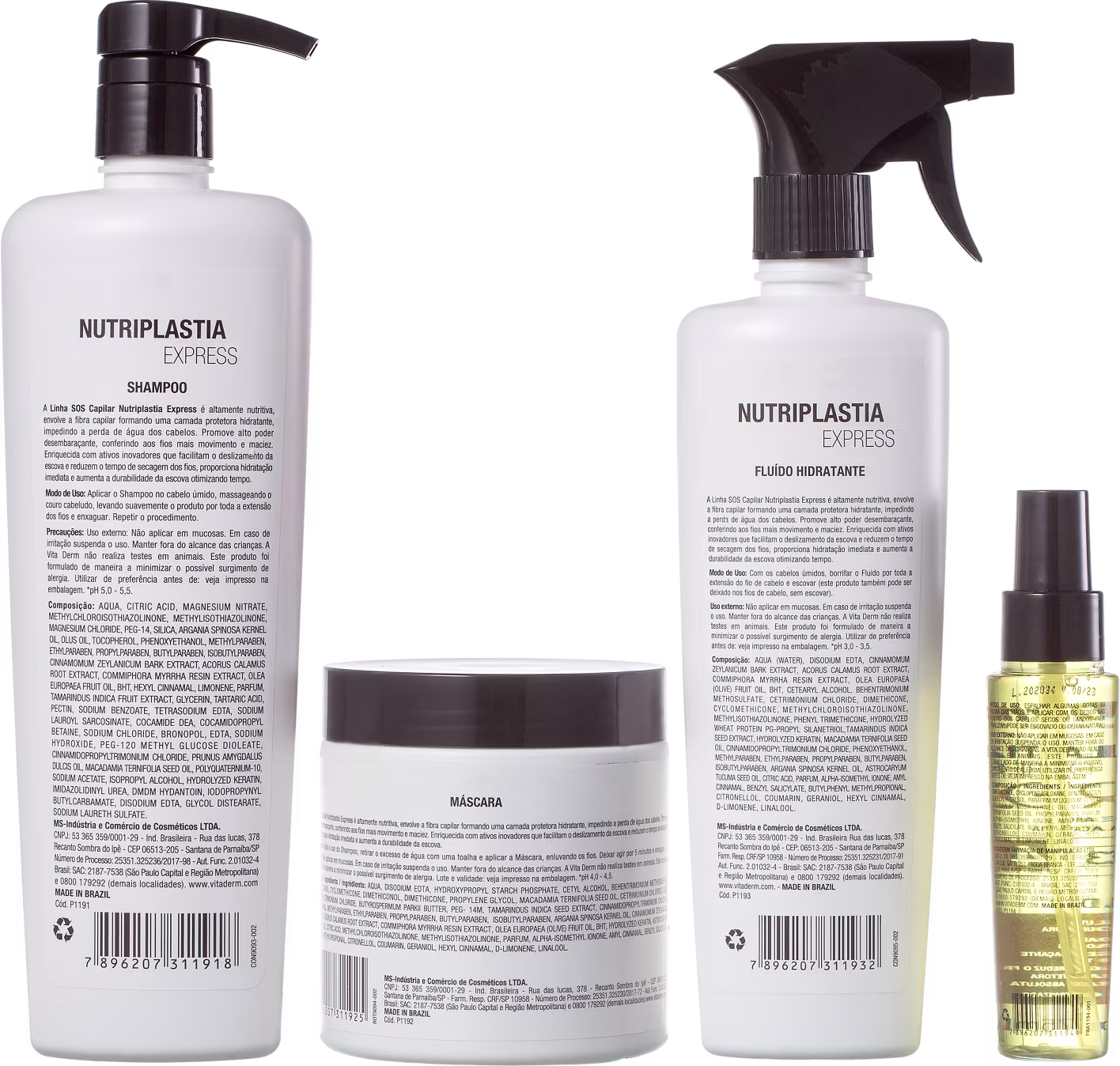 Kit Vita Derm Nutriplastia Express Quarteto com shampoo, condicionador, máscara capilar e sérum reparador para todos os tipos de cabelo.