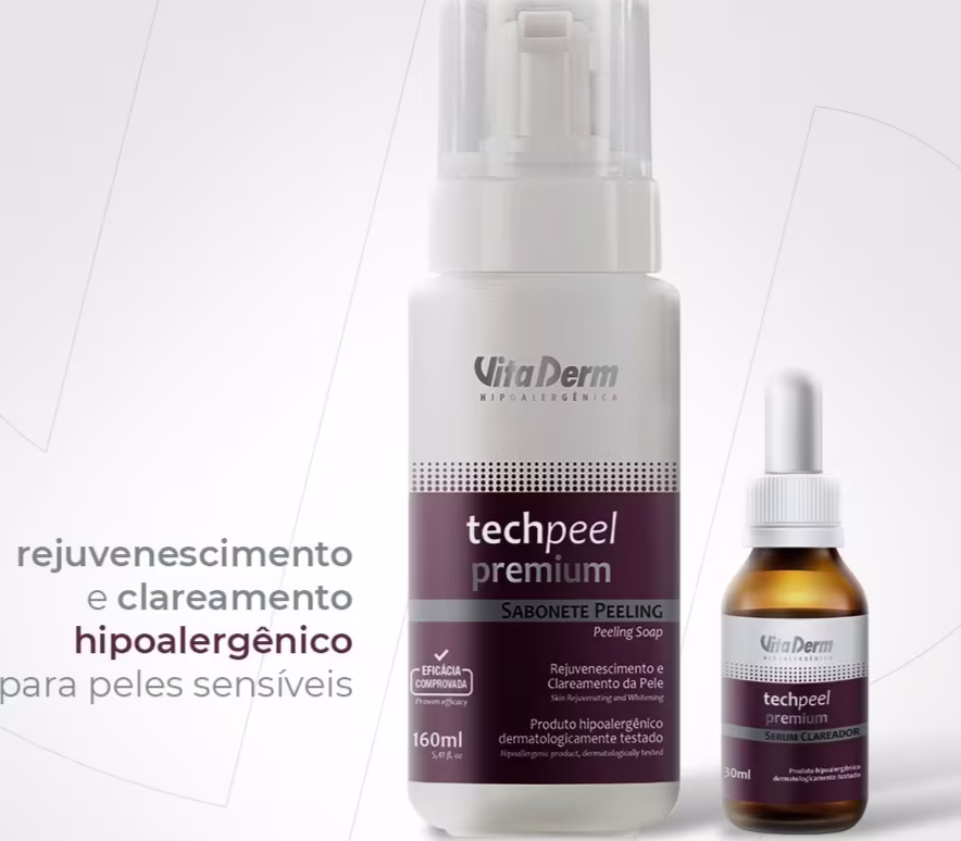 Kit com sabonete e sérum facial. Vita Derm Techpeel Premium Uniformizador uniformiza o tom, previne a formação de manchas e promove efeito lifting.