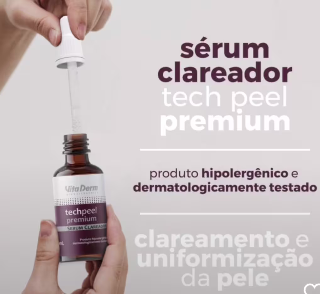 Vita Derm Techpeel Premium - Sérum Clareador 30ml: não oleoso é de fácil absorção, clareia, evita a formação de manchas de diversas espécies, inclusive o melasma. Seu uso contínuo uniformiza o tom da pele, trata e evita formação de novas manchas e sinais do tempo. Pode ser feito em casa. Benefícios: Pele limpa, clara, hidratada, renovada, rejuvenescida e com efeito lifting. Principais ativos: Alga Atlântica, Facelift, Açúcares Raros.