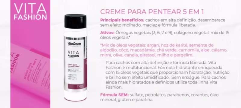 Vita Derm Vita Fashion 5 Em 1 - Creme para Pentear 250ml: proporciona nutrição e brilho sem efeito umidificado para cachos ainda mais hidratados e definidos. Sem enxágue.