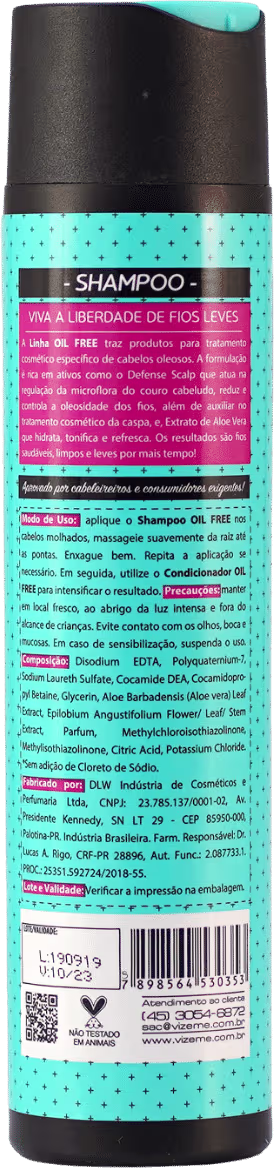 Vizeme Oil Free - Shampoo 300ml: ajuda a reduzir a oleosidade e equilibra a microflora do couro cabeludo.