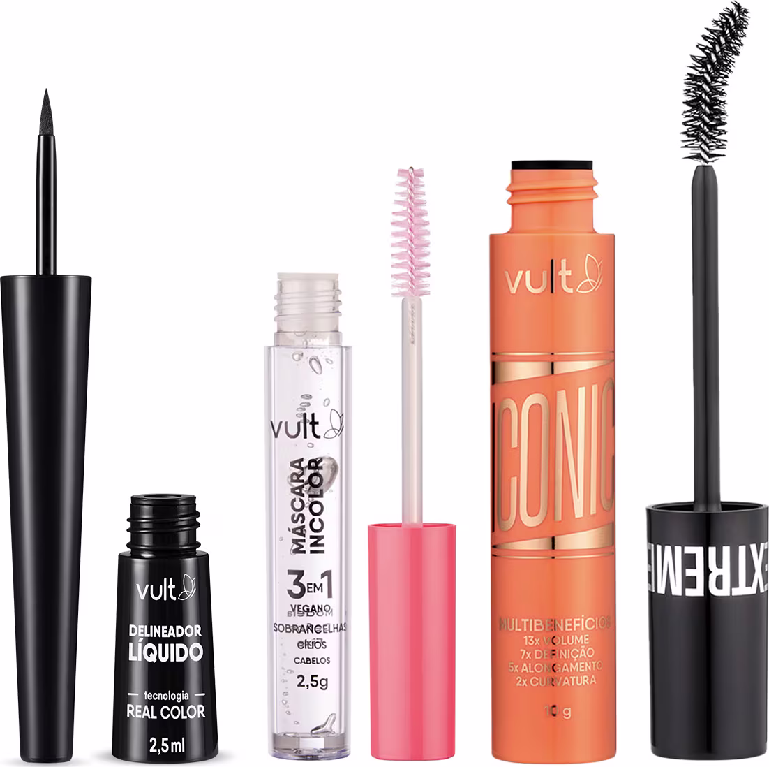 Kit com máscara para cílios preta, máscara incolor para cílios e sobrancelhas e delineador líquido. Vult Make Extreme Iconic conta com itens para destacar o olhar.