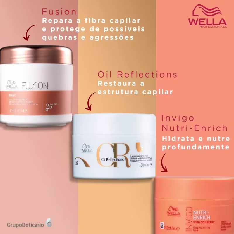 Com mais de 130 anos no mercado, e com origem alemã, Wella Professionals acompanha as tendências década após década e investe em estudos tecnológicos para estar sempre entre as maiores. A marca cuida do cabelo colorido, loiro, oleoso, sem vida, ressecado, envelhecido e com química ou alisamento. Com ativos poderosos, revitaliza a saúde capilar e recupera a beleza, o brilho, a maciez e o movimento dos fios. Há cem anos, a marca inova a cada dia para atender sempre e com mais atenção as suas clientes.