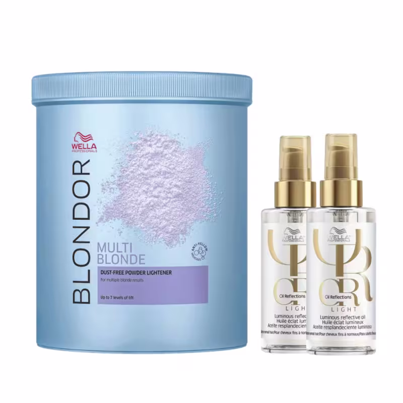 Não sei o CEPKit com pó descolorante e óleo capilar. Wella Professionals Blondor Oil Reflections confere clareamento uniforme, além de proteção e brilho para os fios.