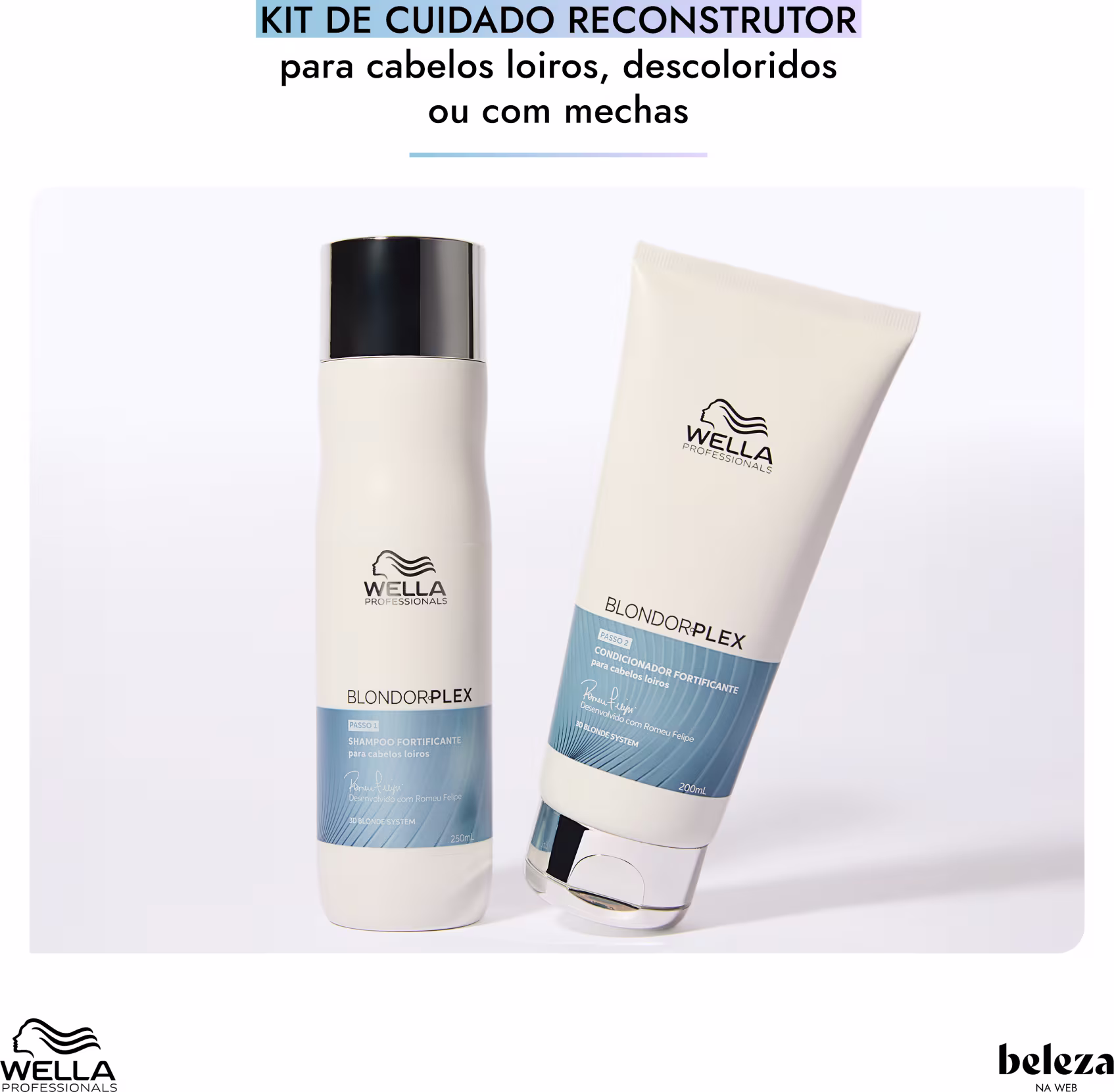 Kit com shampoo e condicionador para cabelos loiros danificados. Wella Professionals BlondorPlex fortalece os fios e repara os danos.
