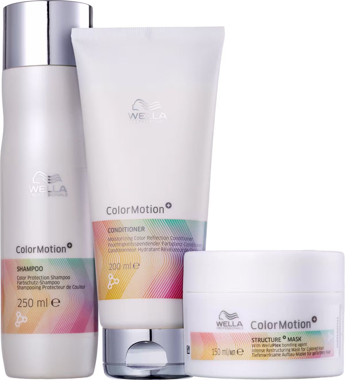 Kit com shampoo, condicionador e máscara para cabelos coloridos e danificados. Wella Professionals Color Motion+ Trio oferece três benefícios especiais: proteção da cor, brilho intenso e cabelos mais fortes, da raiz às pontas.