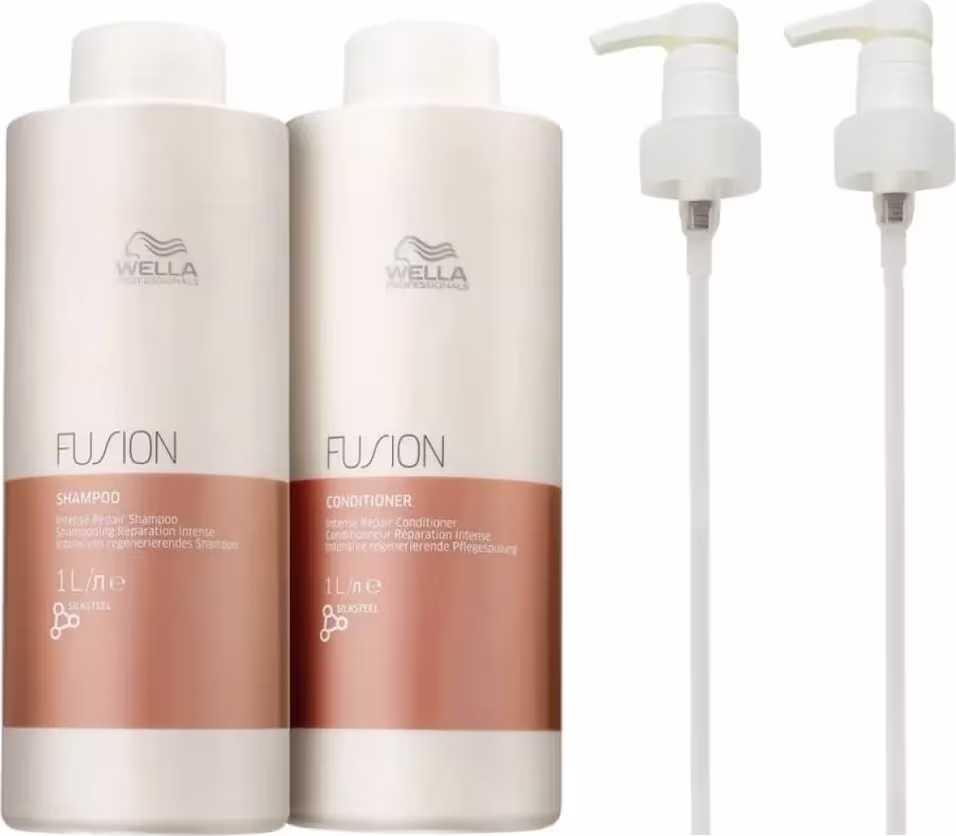 Kit com shampoo e condicionador, com válvulas pump, para cabelos danificados. Kit Wella Professionals Fusion Duo Pro + Válvula Pump oferece efeito reparador.