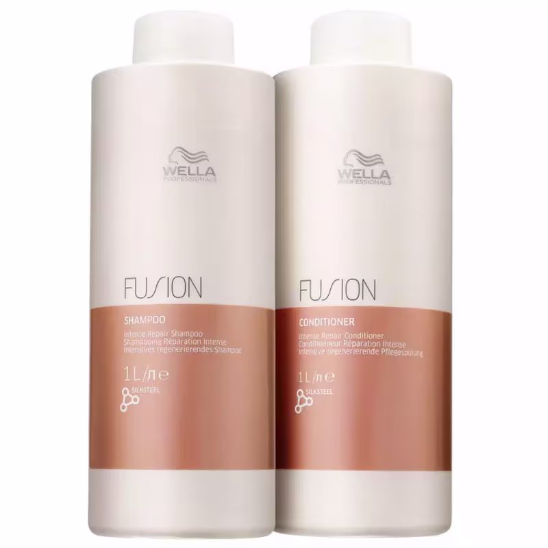 Kit em tamanho salão para cabelos danificados. Wella Professionals Fusion Duo Salon Shampoo & Condicionador ajuda a recuperar a fibra capilar dos danos e evita a quebra.