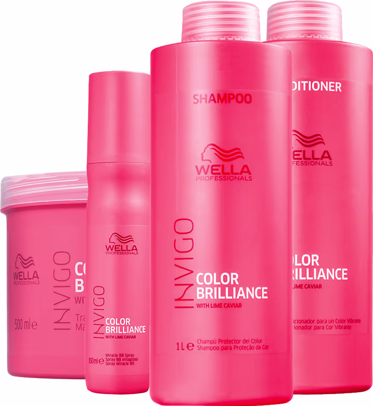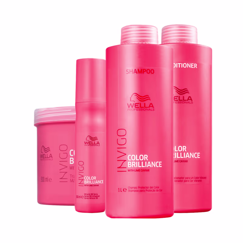 O Kit Wella Professionals Invigo Color Brilliance Completo conta com shampoo, condicionador, máscara e leave-in. Possui fórmulas ricas em antioxidantes que combatem o desgaste da cor, além de selar as cutículas e ajudar a fixar a coloração dentro do fio.