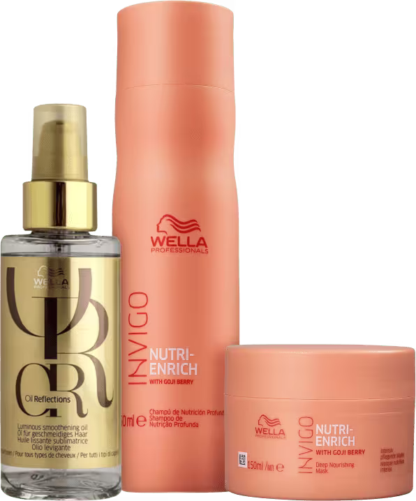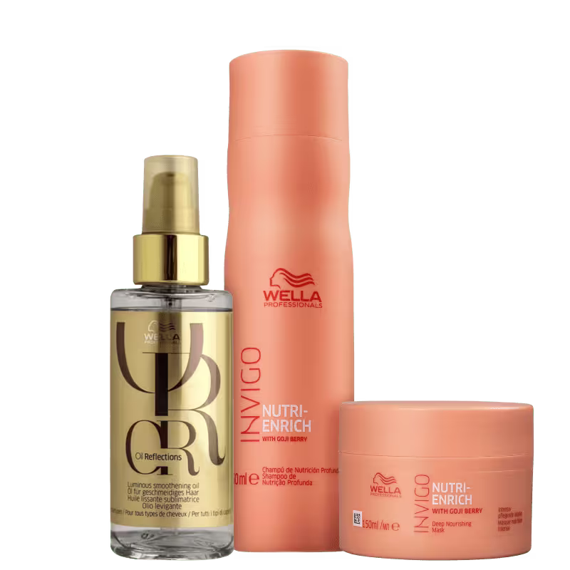 Kit com shampoo, máscara e óleo. Wella Professionals Invigo Nutri-Enrich Triplo para nutrição profunda, brilho intenso e maciez em cabelos secos e quimicamente tratados.