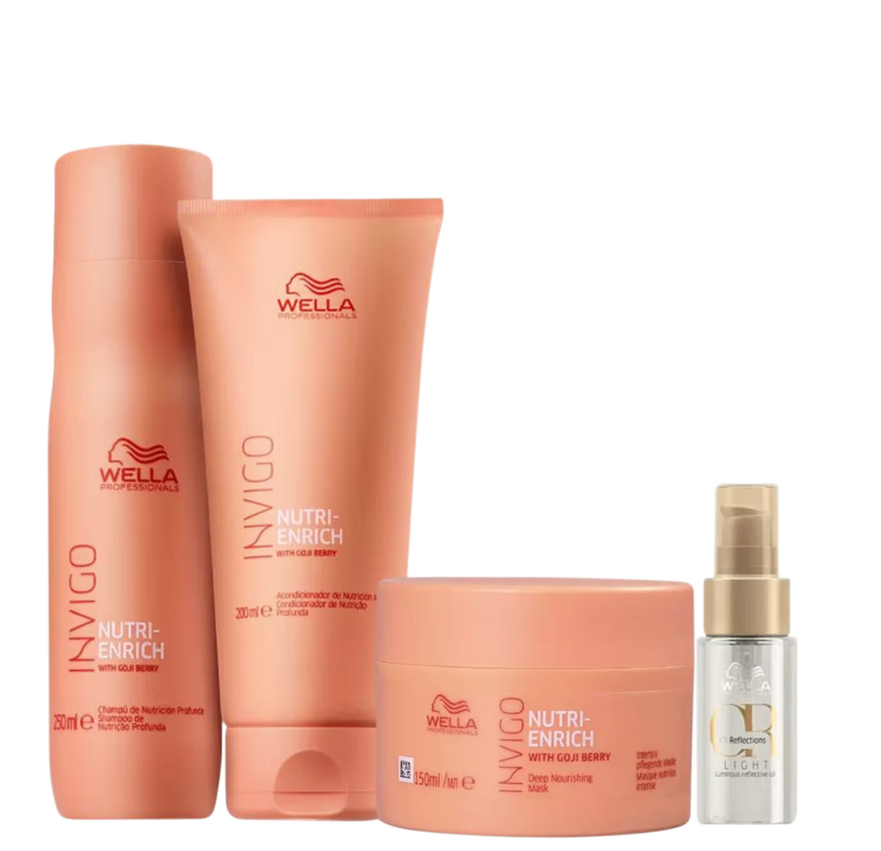 O Kit Wella Professionals Invigo Nutri-Enrich + Oil Reflections Light oi desenvolvido especialmente para cuidar de cabelos que sofrem com o ressecamento. Melhora a qualidade do cabelo, promovendo muito mais brilho e maciez. Seus ingredientes tratam a fibra capilar tanto em sua superfície, suavizando-a, como na parte mais profunda. Além disso, possui um aroma luxuoso frutal chipre almiscarado.