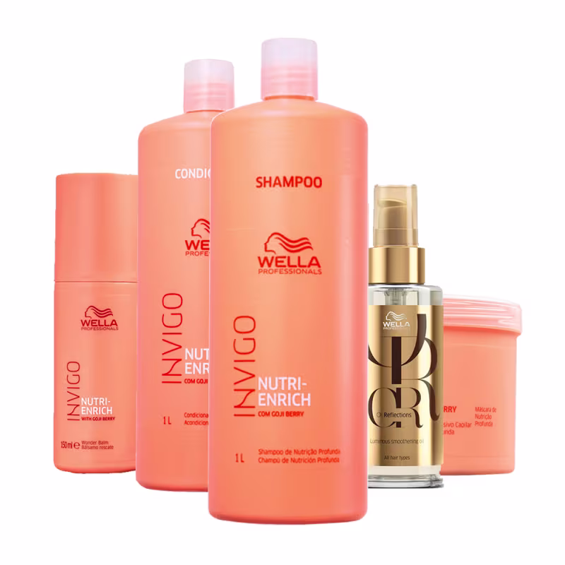 Kit com shampoo, condicionador, máscara, leave-in e óleo para cabelos ressecados. Kit Wella Professionals Invigo Nutri-Enrich Salon Care proporciona suavidade e flexibilidade.