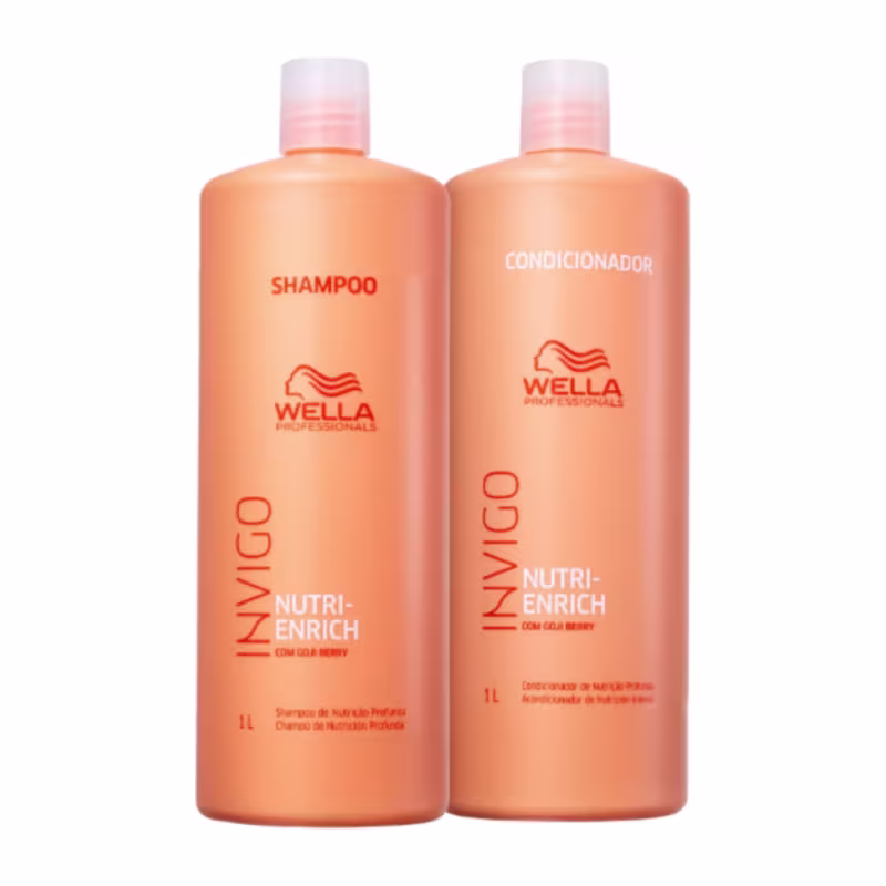 Kit com shampoo e condicionador, em tamanho salão, para cabelos secos, ressecados ou quimicamente tratados. Wella Professionals Invigo Nutri-Enrich nutre e hidrata intensamente para restaurar a saúde dos fios.