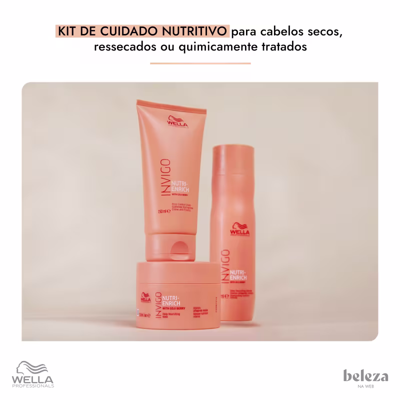 Kit de tratamento para cabelos secos, ressecados ou quimicamente tratados. Wella Professionals Invigo Nutri-Enrich recupera a saúde dos fios ao nutrir profundamente. Assim, melhora a qualidade do cabelo, que ganha muito brilho e maciez.