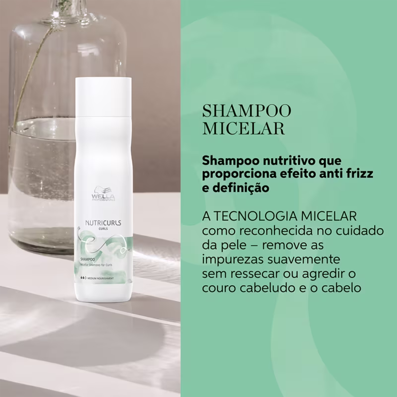 - Wella Professionals Nutricurls - Shampoo 250ml: possui tecnologia micelar que limpa sem retirar a oleosidade natural e ainda mantém o nível certo de hidratação e nutrição.