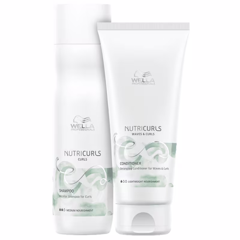 Kit Wella Professionals Nutricurls Duo Care nutre profundamente os fios, mantém as curvas macias, com movimento e com o formato bem marcado. Higienização suave, sem ressecar os fios.