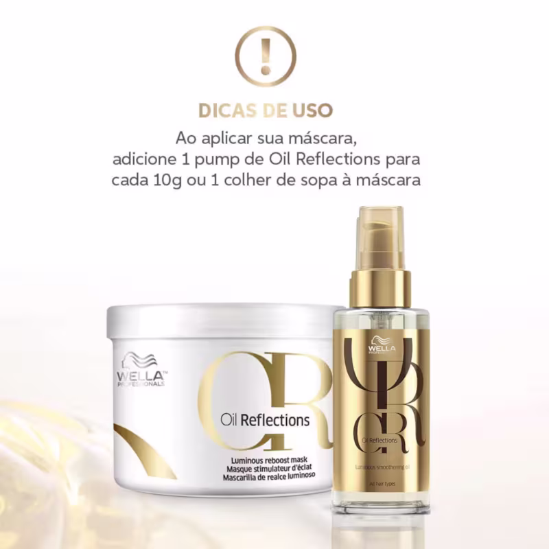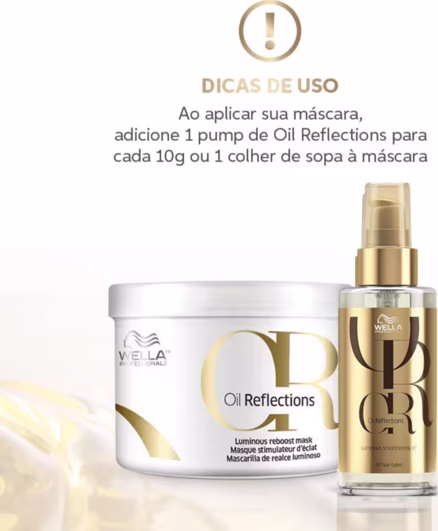 Não sei o CEPKit com máscara e óleo capilar para todos os tipos de cabelo. Wella Professionals Oil Reflections Grand Pro proporciona fios sedosos e iluminados.