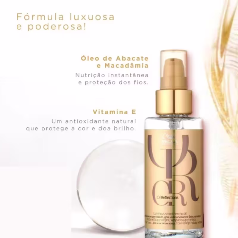 Wella Professionals Oil Reflections - Óleo Capilar 100ml: proporciona um efeito gloss e nutre o cabelo com proteção às agressões externas. É extremamente versátil e pode ser usado como pré-shampoo, tratamento noturno, leave-in, proteção térmica contra secador e extra brilho.