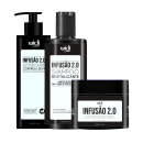 Kit com shampoo, máscara e acidificante para cabelos danificados. Widi Care Infusão 2.0 Trio Completo oferece revitalização intensa aos fios.
