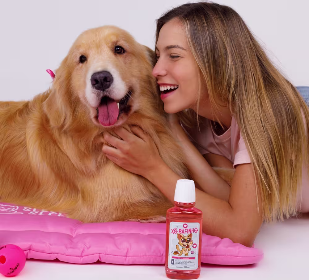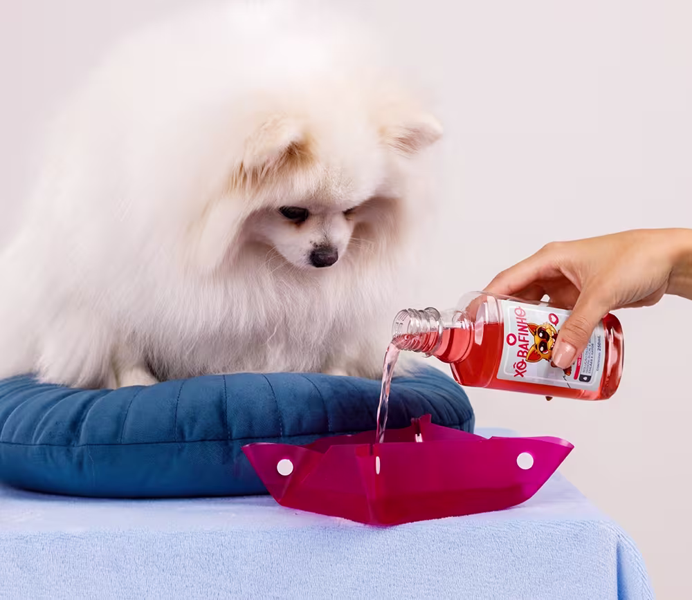 Kit com solução para higiene bucal de cães e gatos. Xô Bafinho Higiene Bucal Pet ajuda no tratamento e previne tártaros, cáries e gengivite.